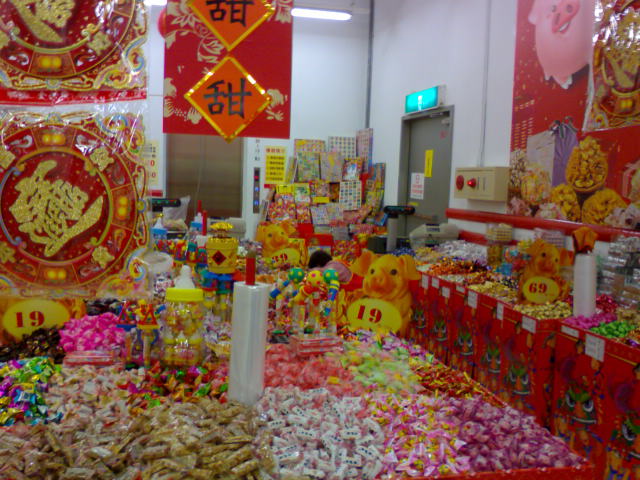 さて、旧正月前によく見る光景のひとつに、写真のような『糖果』を山積みにして販売しているものがあります。